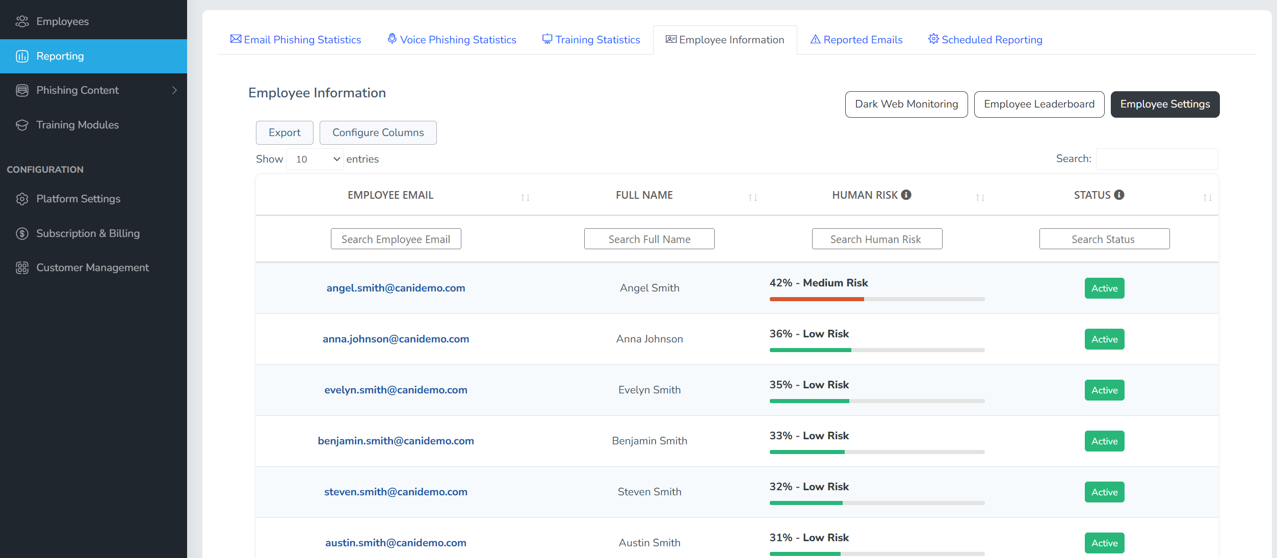 CanIPhish extract unique email addresses listed in employee lists and campaign statistics, we then attribute these email addresses to unique employees and investigate their performance across various aspects of the platform to determine their overall human risk.