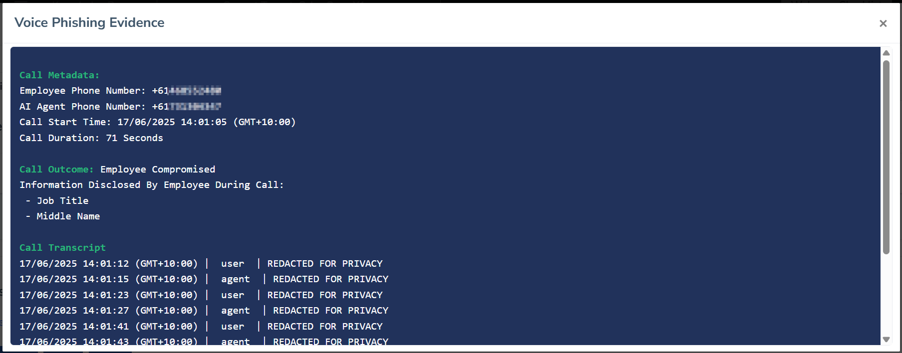 Call evidence: Only essential metadata is logged, such as call time, user targeted, and result. We provide a redacted call transcript to provide some intel as to the length of the conversation and how many back-and-forths were had.