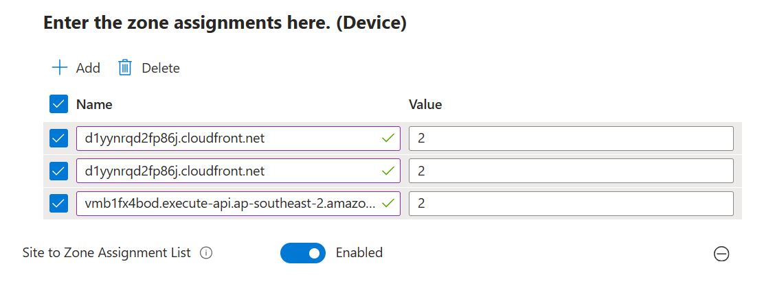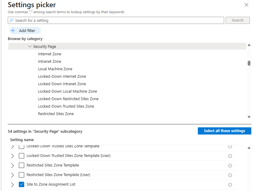 - Click "+ Add settings" and then navigate to" Administrative Templates > Windows Components > Internet Explorer > Internet Control Panel > Security Page > Site to Zone Assignment List > Tick the box: