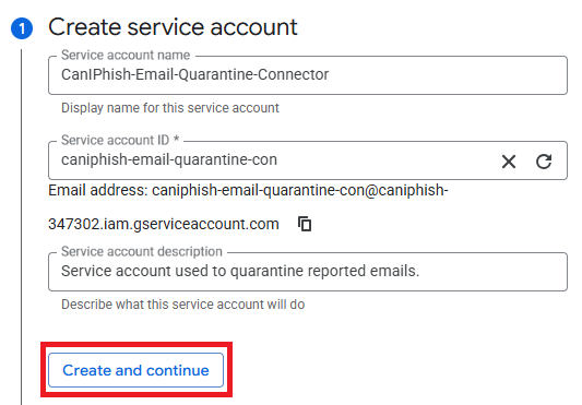 1.3. Enter a unique name that clearly distinguishes the service accounts purpose (e.g. CanIPhish-Email-Quarantine-Connector - this name can be anything you choose). Then click CREATE AND CONTINUE: