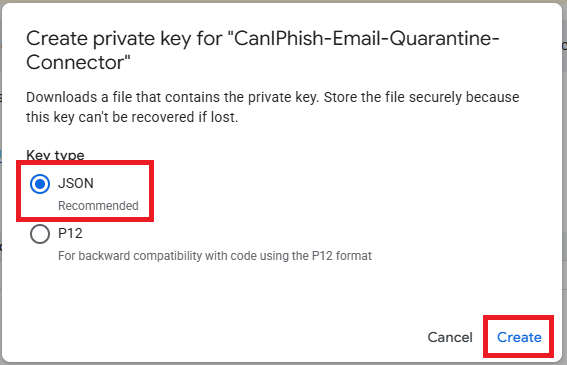 1.7 Select JSON for the 'Key type' and then click CREATE. The newly created key should automatically download once created: