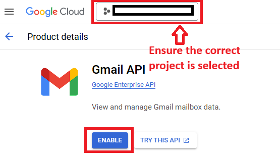 2.7. Confirm the Gmail API is enabled on the Google Cloud Project used by your Google Workspace Account. This can be confirmed by traversing to the following link and clicking the Enable button if visible: https://console.cloud.google.com/apis/library/gmail.googleapis.com