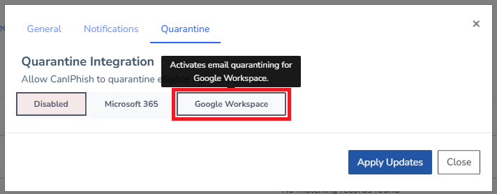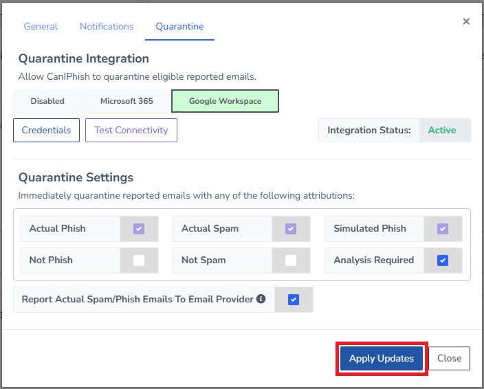 2.7. Configure the Quarantine Settings to suit your needs and then click Apply Updates to finalize the integration. For information on what each setting does, please see the Frequently Asked Questions below.