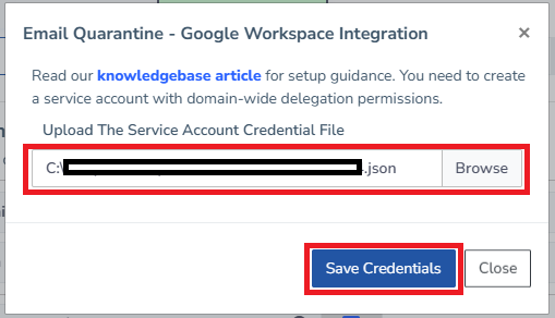 2.3. A popup will appear prompting you to provide the Service Account Credential File downloaded earlier (Step 1.7). Please select this JSON file from your directory, and then click Save Credentials.