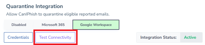 CanIPhish can integrate with Google Workspace through the use of a Service Account to quarantine emails reported through CanIPhish's Gmail Report Email Add-in. Implementing this functionality significantly improves the email report experience, as reporters don't need to manually move emails to the trash or spam folders after a report takes place.