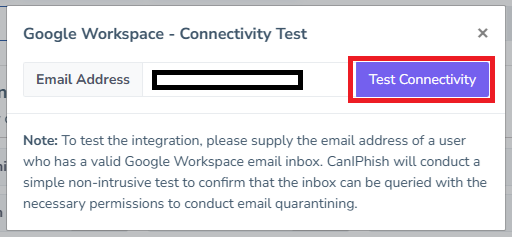 2.6. In the popup that appears, provide the email address of a user who has a valid Google Workspace email inbox, and then click Test Connectivity. A simple test is run to see if the users mailbox can be queried via Google's Gmail API (i.e. a simple test to check that the credentials can see the mailbox exists). If successful, you will be notified via a small success popup. If successful, close the Connectivity Test popup.