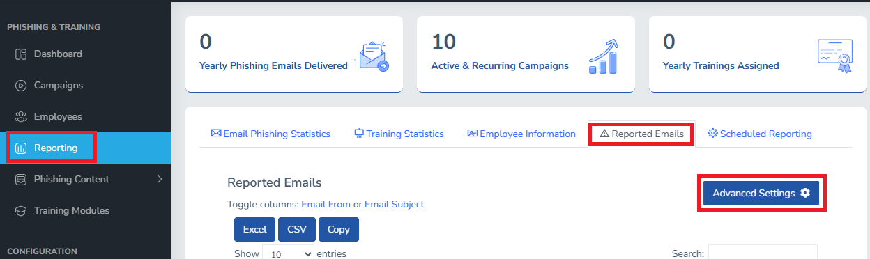 3.1. Login to your CanIPhish account and navigate to the Reporting page and then to the Reported Emails tab. Finally, click the Advanced Settings button.