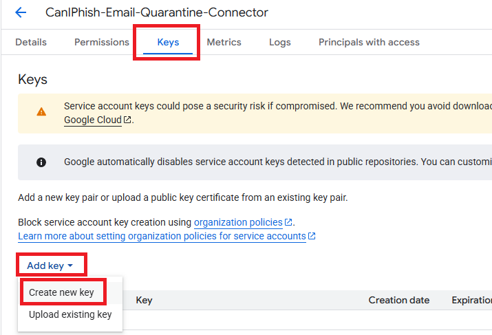1.6. While still looking at the Service Account, click the 'KEYS' tab and click ADD KEY > Create new key: