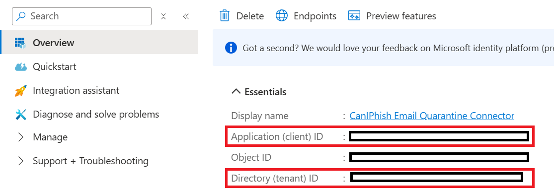 1.5. While on the Overview page, copy the Application ID and Tenant ID values to your clipboard or a text editor as you'll need them later: