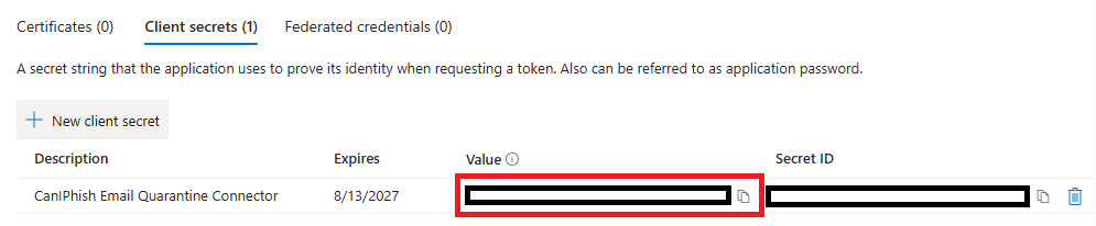 1.19. Your secret will now appear in the Client secrets table. Copy the Value of your newly created secret to your clipboard or text editor: