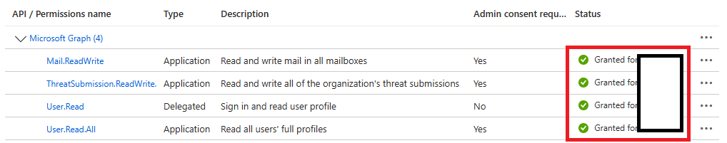 ThreatSubmission.ReadWrite.All: Used to send a threat submission to Microsoft, which contains the reported email. This helps to train Microsoft's detection algorithms to help prevent future emails of this nature from being received by other individuals within your organization.