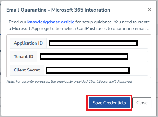 2.3. A popup will appear prompting you to enter an Application ID, Tenant ID, and Client Secret. Each of these will have been gathered during the App registration process followed in Step 1. One-by-one, paste these values into their respective fields, and then click Save Credentials.
