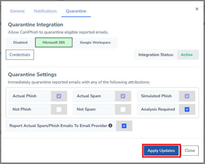 2.5. Configure the Quarantine Settings to suit your needs and then click Apply Updates to finalize the integration. For information on what each setting does, please see the Frequently Asked Questions below.
