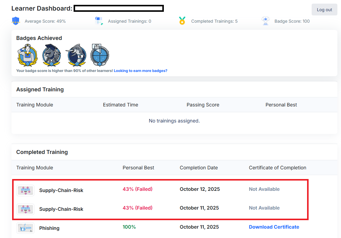If the training attempt limit is hit, the training will be permanently marked as failed within both the learner dashboard, and training campaign statistics view. From the view of the platform, failed trainings are considered complete, and will appear but no certificate of completion is issued to the learner. The failed training appears as follows: