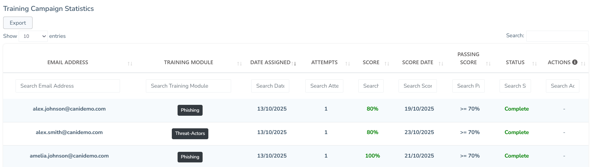 Training Campaign Statistics: