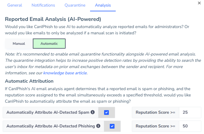 - Automatically Attribute AI-Detected Phishing: If the AI Analysis Engine has both a reputation score that exceeds the defined threshold AND is classified as malicious, then the email report will be automatically attributed as Actual Phishing.