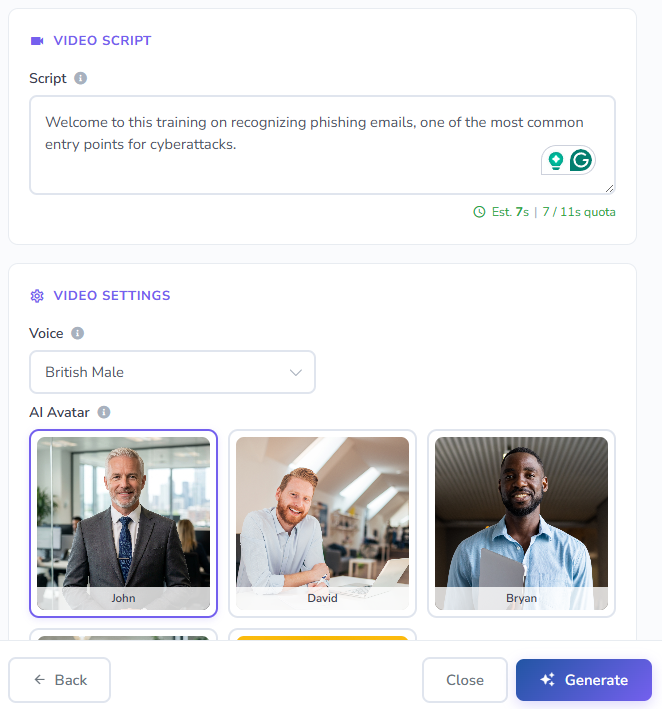 - Training Video: An AI-generated video featuring a virtual avatar narrating a script you provide.