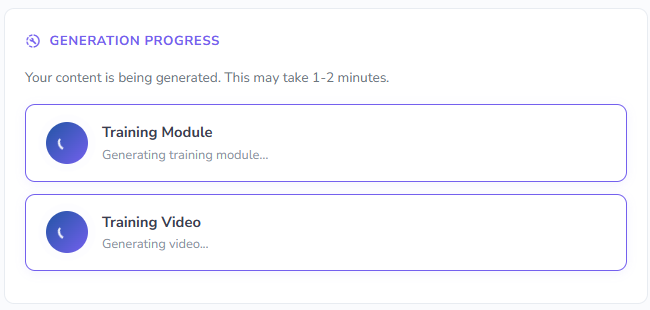Training modules typically take 1–2 minutes. Video generation time depends on script length — short scripts take 1–2 minutes while longer scripts may take up to 10 minutes.