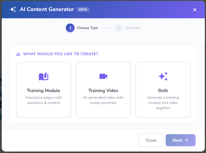 - Both: Generates a training module and video together. The video is automatically embedded on the first page of the module.