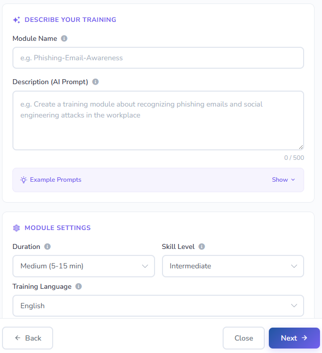 - Description (AI Prompt): A clear description of the training topic (max 500 characters). The more specific your prompt, the better the generated content. Example prompts are available for inspiration.
