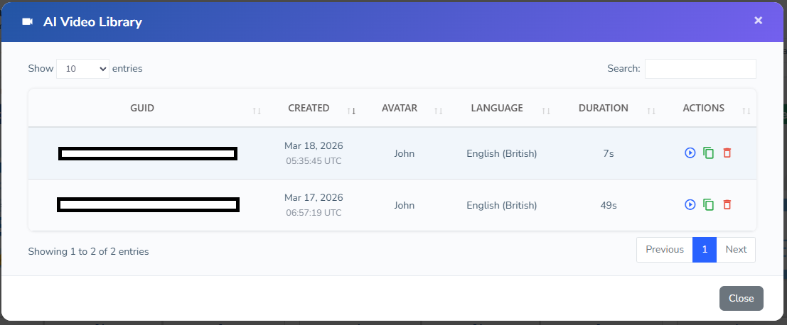 Each entry displays the video GUID, creation date, avatar, language, and duration.