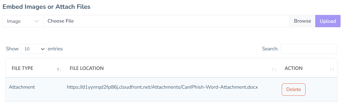 - Image: If an image is uploaded for embedding, the image will get saved to a CanIPhish controlled cloud-storage location with public read rights enabled. You can then embed this image and the location into the email body.
