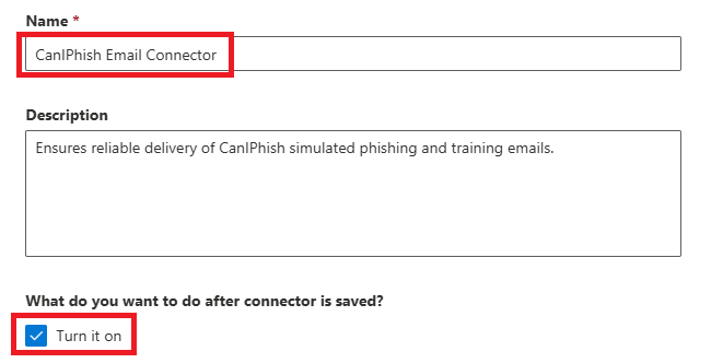 9. Enter a name for the connector, such as: CanIPhish Email Connector