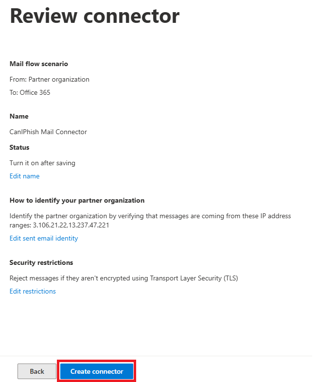 Get-InboundConnector -Identity "CanIPhish Email Connector" | Format-List Name,Enabled,ConnectorType,SenderDomains,SenderIPAddresses,RestrictDomainsToIPAddresses,RequireTlsYou're all done!