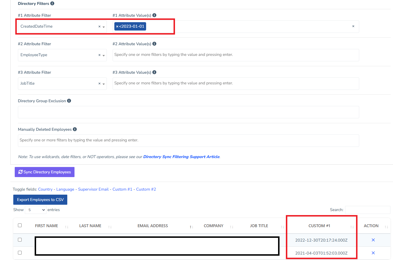 Date filtering is supported on specific fields within both Entra ID/Azure AD and Google Workspace. Date filters can be applied for dates that are either greater OR less than the date specified in the filter attribute value section through the use of angle brackets.