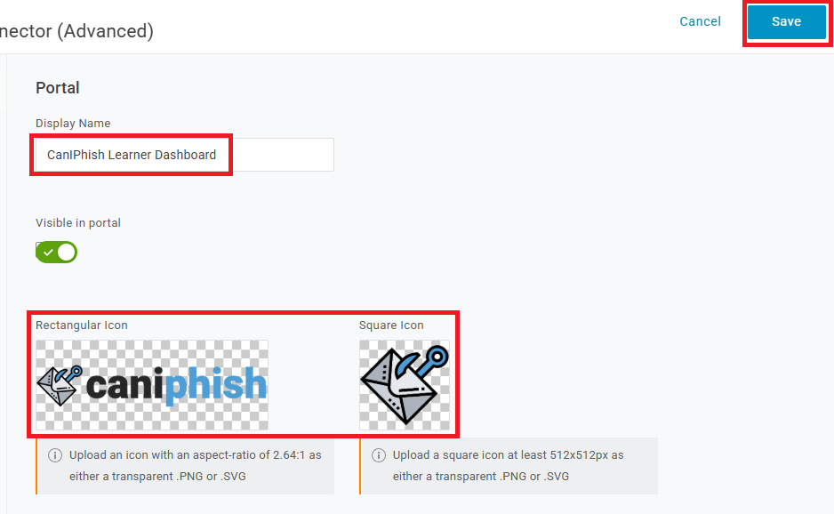 2.5. Give the app a name of your choosing (e.g. CanIPhish Learner Dashboard), and optionally upload CanIPhish's logo (Rectangular Icon / Square Icon). Once complete, click Save.