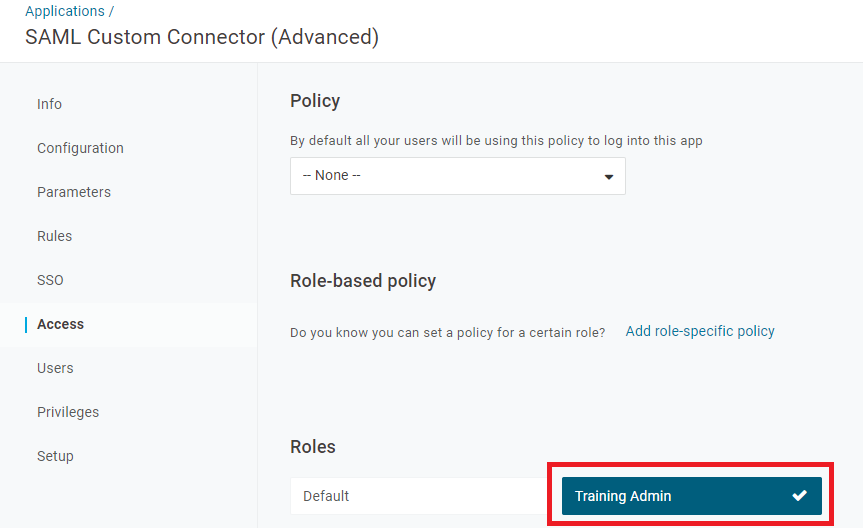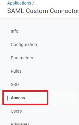 5.1. There are a number of ways this can be done. You can either directly assign the application to users or attach it to roles. We'll showcase how to attach it to a role. Jump back into the Application created in OneLogin and click on the Access menu item on the left panel.