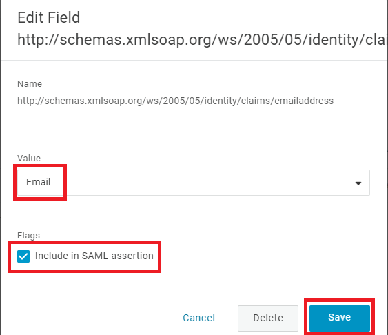 2.12. In the Edit Field popup that has appeared, select Email from the available dropdown Values, leave the SAML Assertion Flag as its default value (ticked) and then click Save.