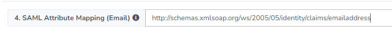 3.5. In the "SAML Attribute Mapping (Email)" field, paste the Attribute field name we configured earlier in OneLogin. This should be: http://schemas.xmlsoap.org/ws/2005/05/identity/claims/emailaddress