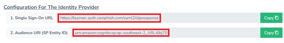 1.3. Make a note of both the Single Sign-On URL and Audience URI values (we'll need these in the following step).