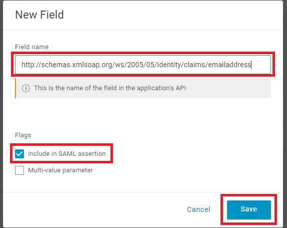 2.11. In the "New Field" popup, enter the following Field Name and tick the "Include in SAML assertion" flag, followed by clicking the Save button.