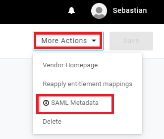 3.1. Before jumping back into the CanIPhish Cloud Platform, click the "More Actions" button on the top right side of the OneLogin application page and then click the "SAML Metadata" sub-menu item which will initiate a file download. Make a note of this file as we'll need it for this step.