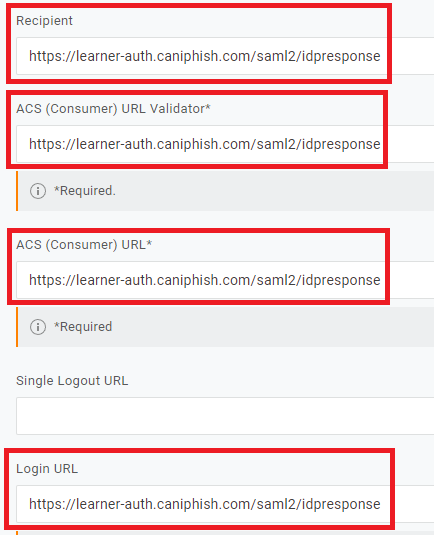 2.8. In the "Recipient", "ACS (Consumer) URL Validator", "ACS (Consumer) URL", and "Login URL" fields, enter in the "Single Sign-On URL" value copied in Step 1.3 from CanIPhish. Leave all other values as their default and then click Save.