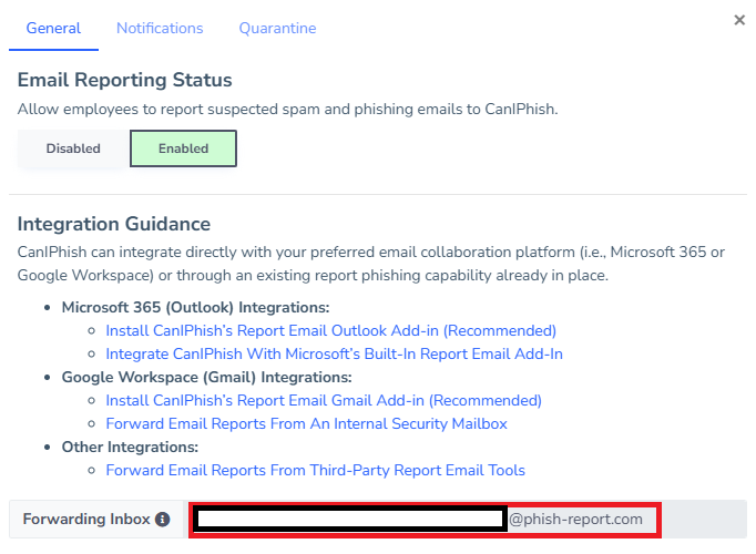 2. Your dedicated tenant-specific CanIPhish mailbox is located in the Forwarding Inbox field: